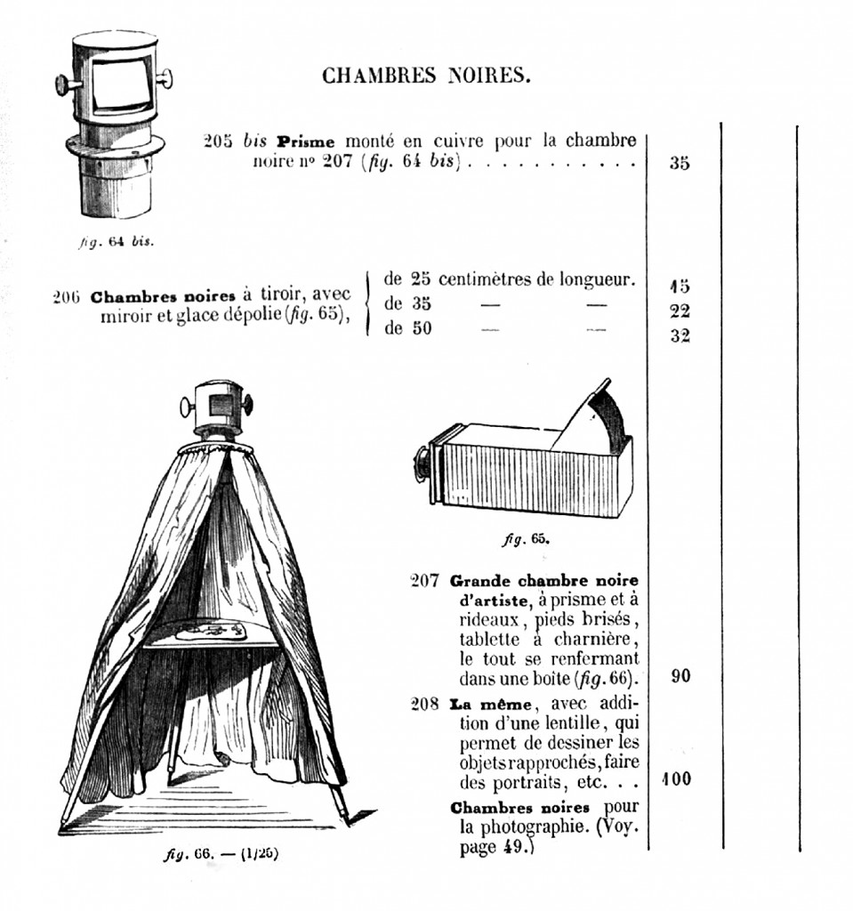 (Above) Lerebours et Secretan Scientific Instrument Catalog (1853). This catalog offers both a “field tent” for drawing landscapes (fig. 66, lower left) and a portable camera obscura box for small drawing (fig. 65, middle right). The box, which looks like a photographic camera, has an adjustable lens and ground glass to receive the image. The artist places vellum or other thin paper on the ground glass to trace the image. In this version, the artist has now left the dark chamber and works from the outside of the box.