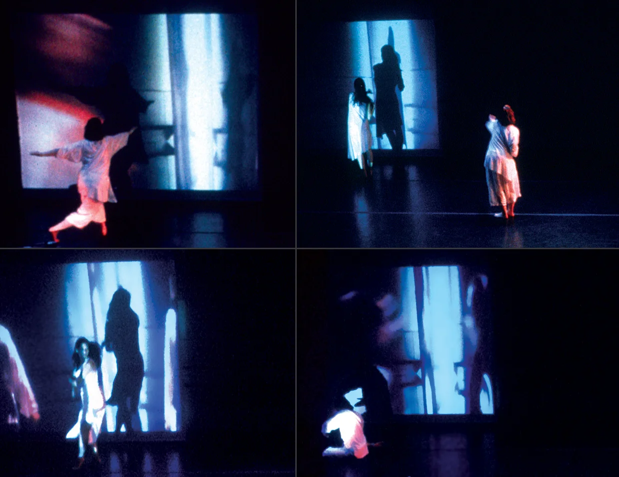 This dance fractures and distorts the relationship between two figures through a variety of visual filters. Dancers move through various thresholds of space defined by the frame of a camera and its simultaneous projection. The camera frame overlaps its live feed projection after reflecting in a large ballet mirror. The overlap creates a feedback zone, which multiplies the images created by figures crossing the video cone of vision. As dancers cross the various projection fields, their image, shadows and reflections supplement physical movements with virtual counterpoint. Boundary crossings are translated into multiple virtual dancers in the form of projection, shadow, and mirror figures.