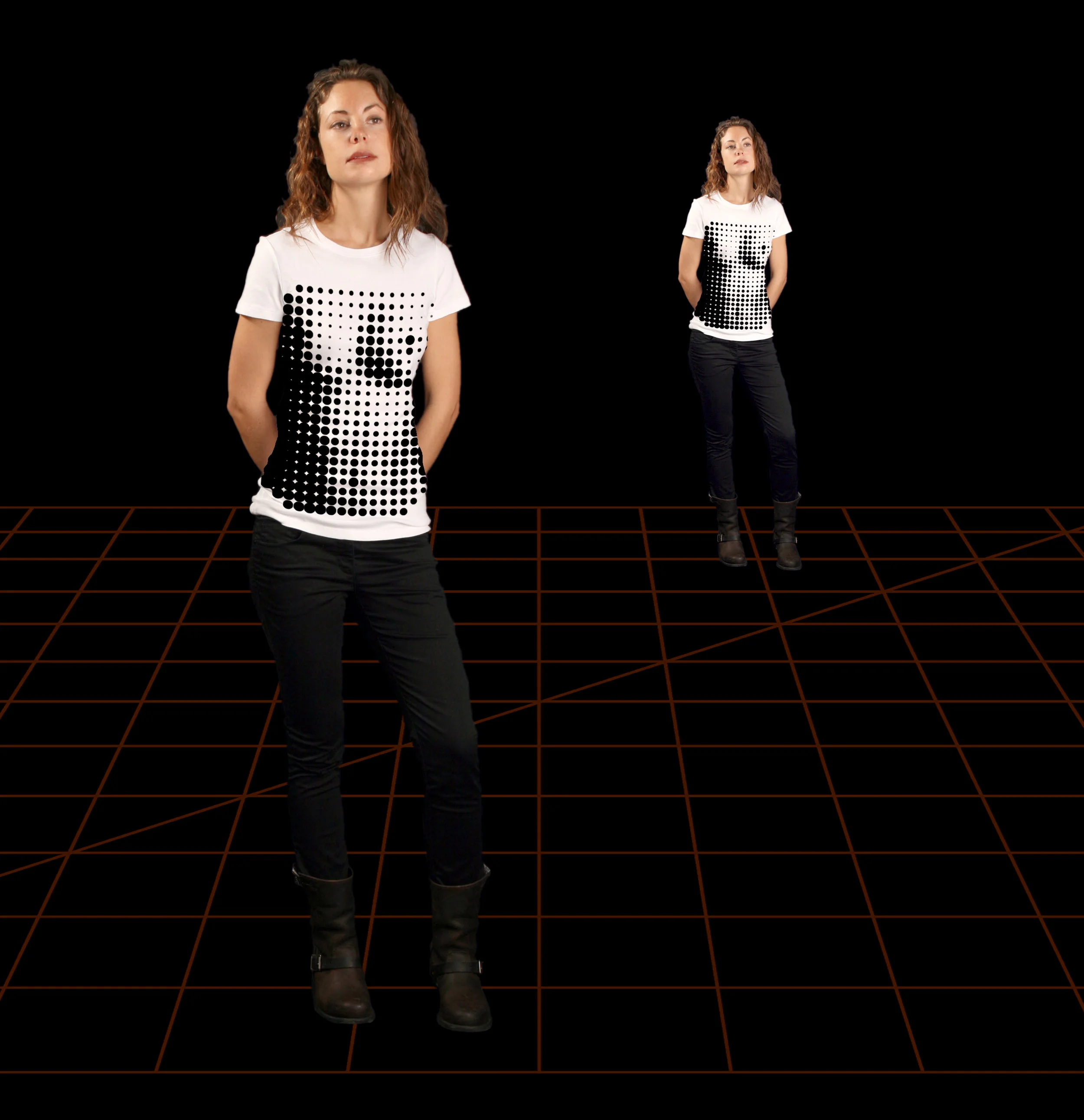 Most tees are the same: splashy graphic or logo centered on a shirt for others to read. Vantage Tees are site-specific art pieces using optical illusions and body-specific effects to change everything about how people interact with their attire. Some shirts look different if you are looking at them or wearing them. Some ask you to be really close or really far. Others take time to see them. Vantage Tees will look different to everyone—it all depends on your vantage point.