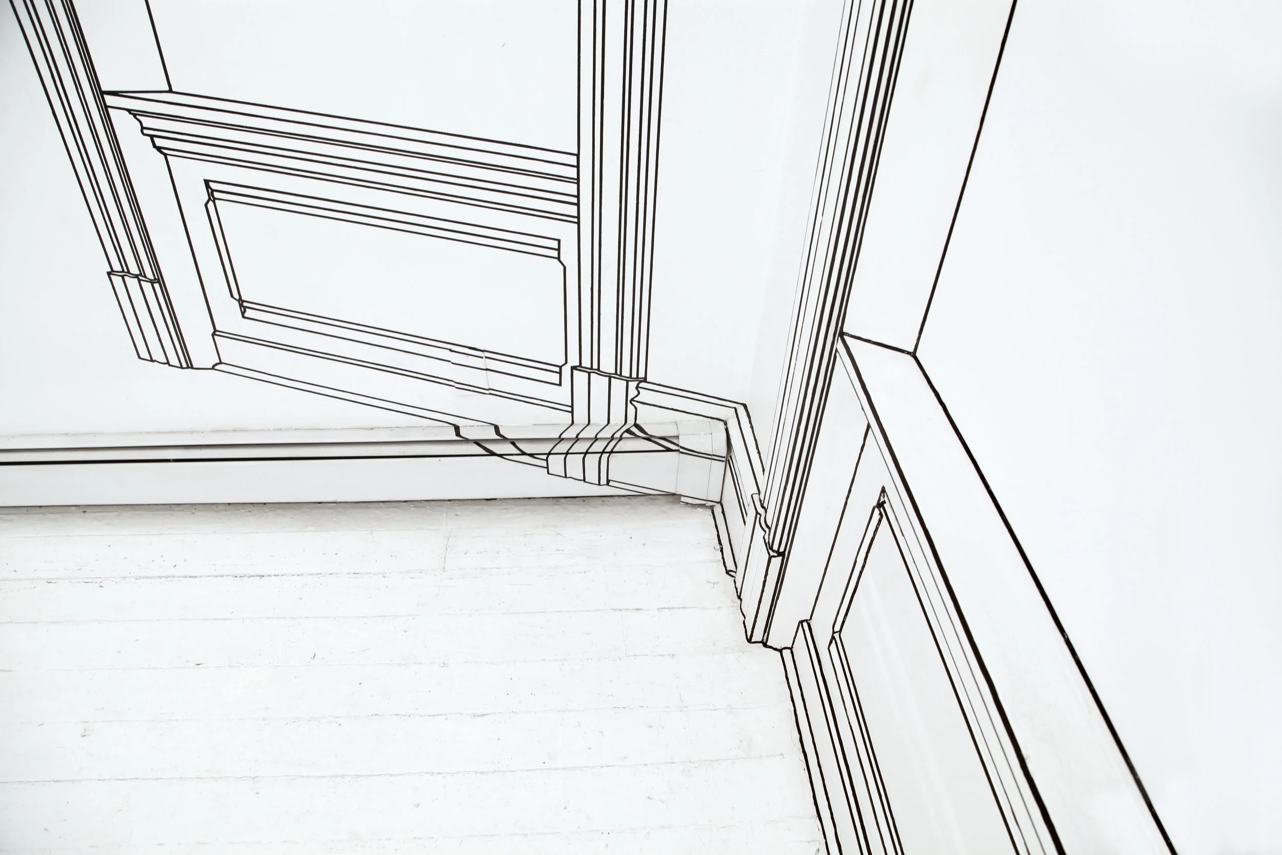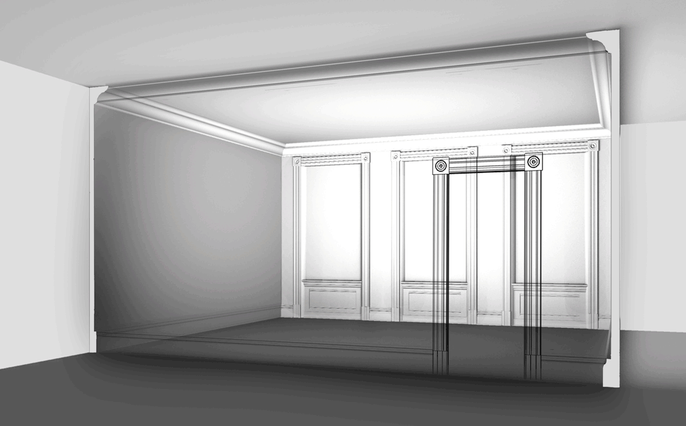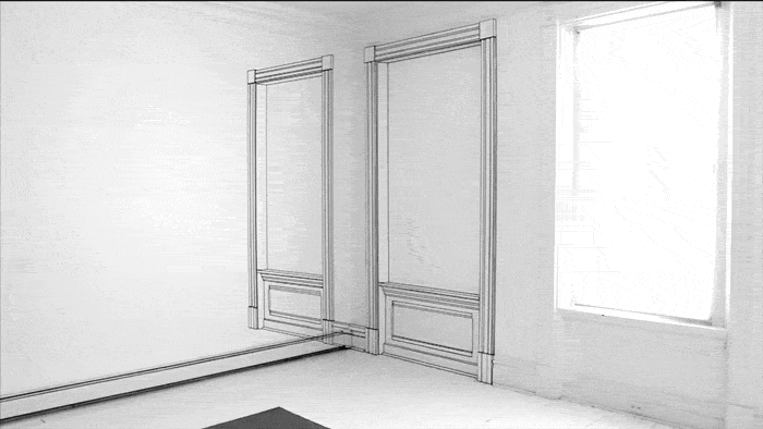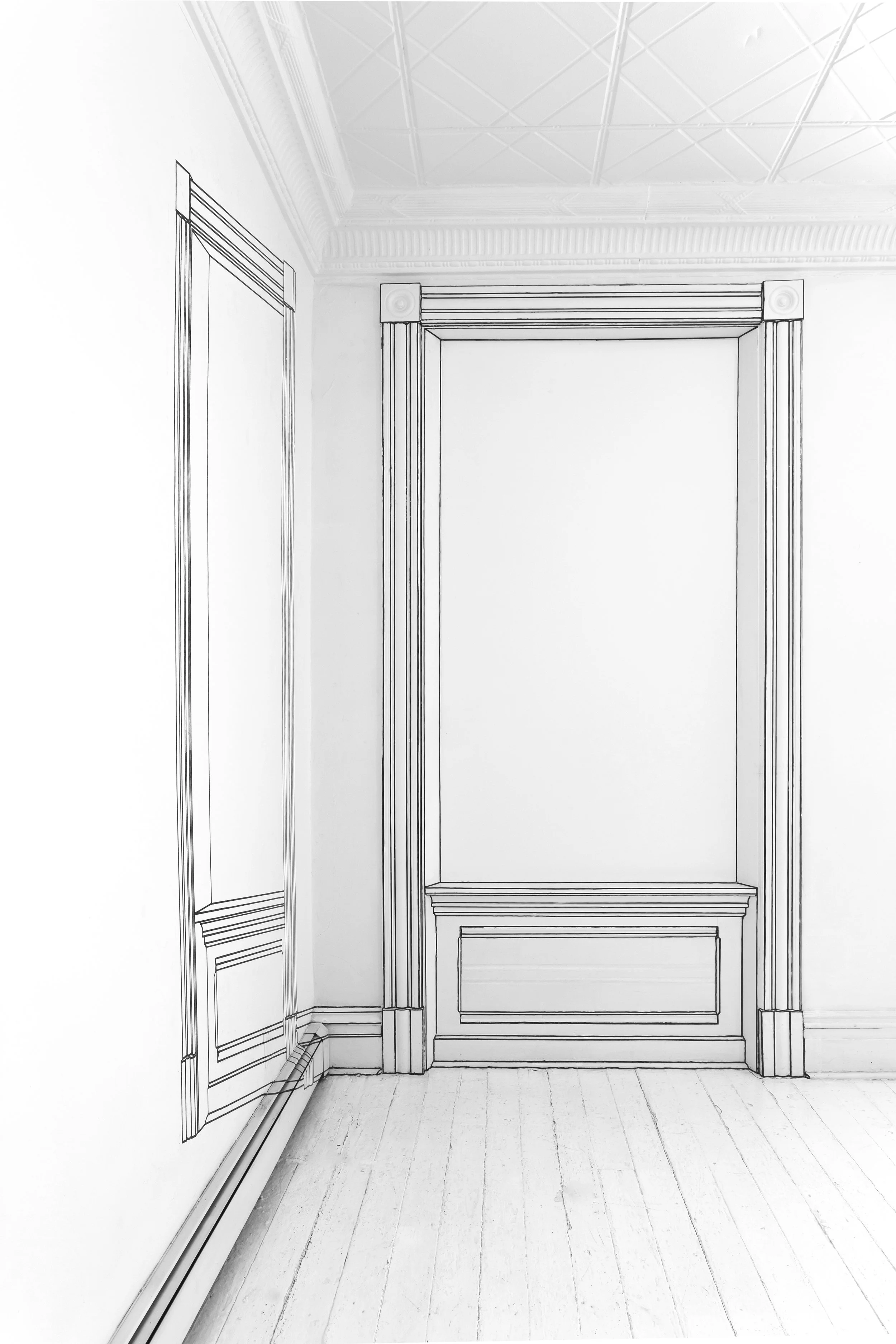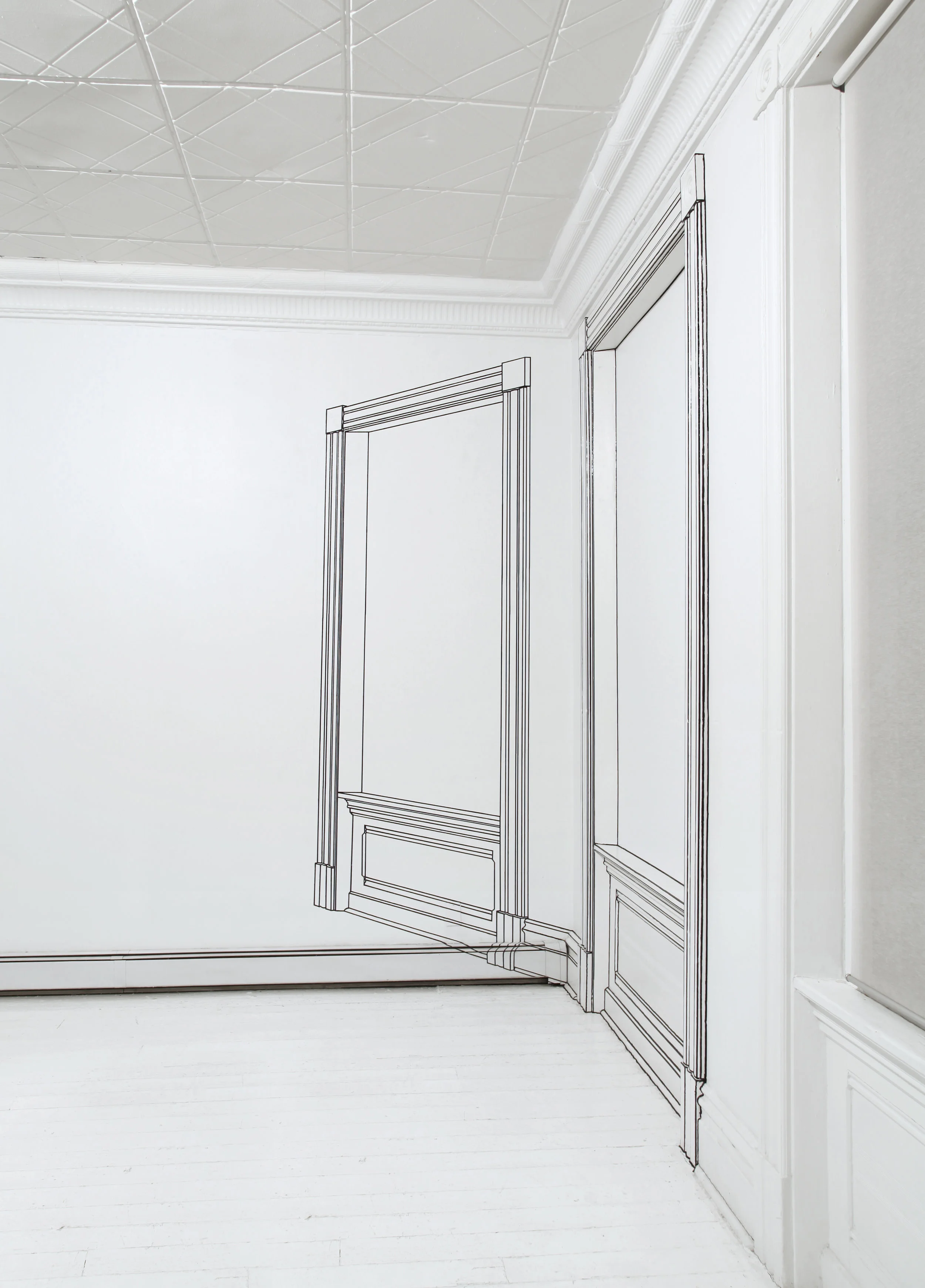To create the illusion, centuries-old techniques of perspective and anamorphic projection drawing merge with new computational methods. After measuring the room, digital models assist in aligning the illusion with the unique vantage point: the only door into the room. With the geometry established, key points mapped on the wall guide the hand-painted completion of the illusion. From the door, the illusion—a trompe l'oeil—renders the view of the false window as in line with the existing room. Once you walk into and around the room, the illusion breaks down, revealing the window illustration as a trick of geometry.